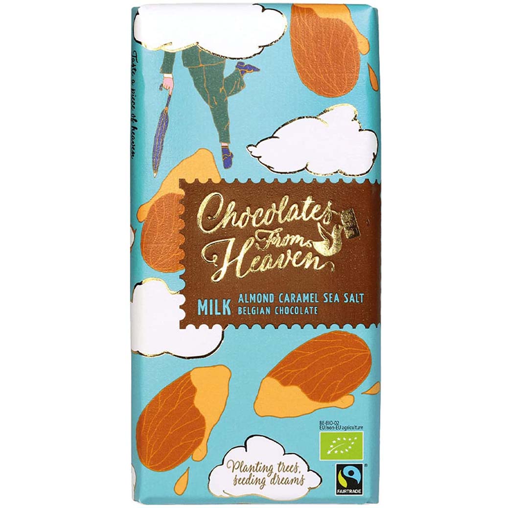 شوكولاتة من هيفين شوكولاتة الحليب البلجيكية العضوية، اللوز، الكراميل، ملح البحر، 100 جم