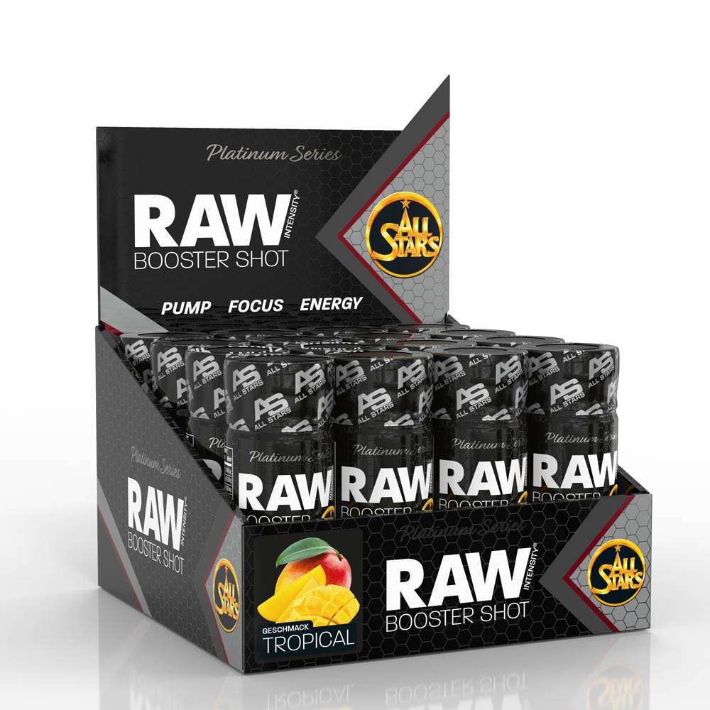 All Stars Raw Booster Shots، تروبيكال، صندوق مكون من 12 طلقة، يوفر دفعة مكثفة من الطاقة لتحقيق أقصى قدر من كثافة التمرين. تم تصميم هذه الجرعات الجاهزة للشرب لتوفير الراحة والفعالية، مما يجعلها مثالية للاستخدام أثناء التنقل. تحتوي كل لقطة على RAW Power Matrix، الذي يدعم المضخة والطاقة والتركيز أثناء التدريب. يضمن الشكل السائل امتصاصًا سريعًا للمكونات.