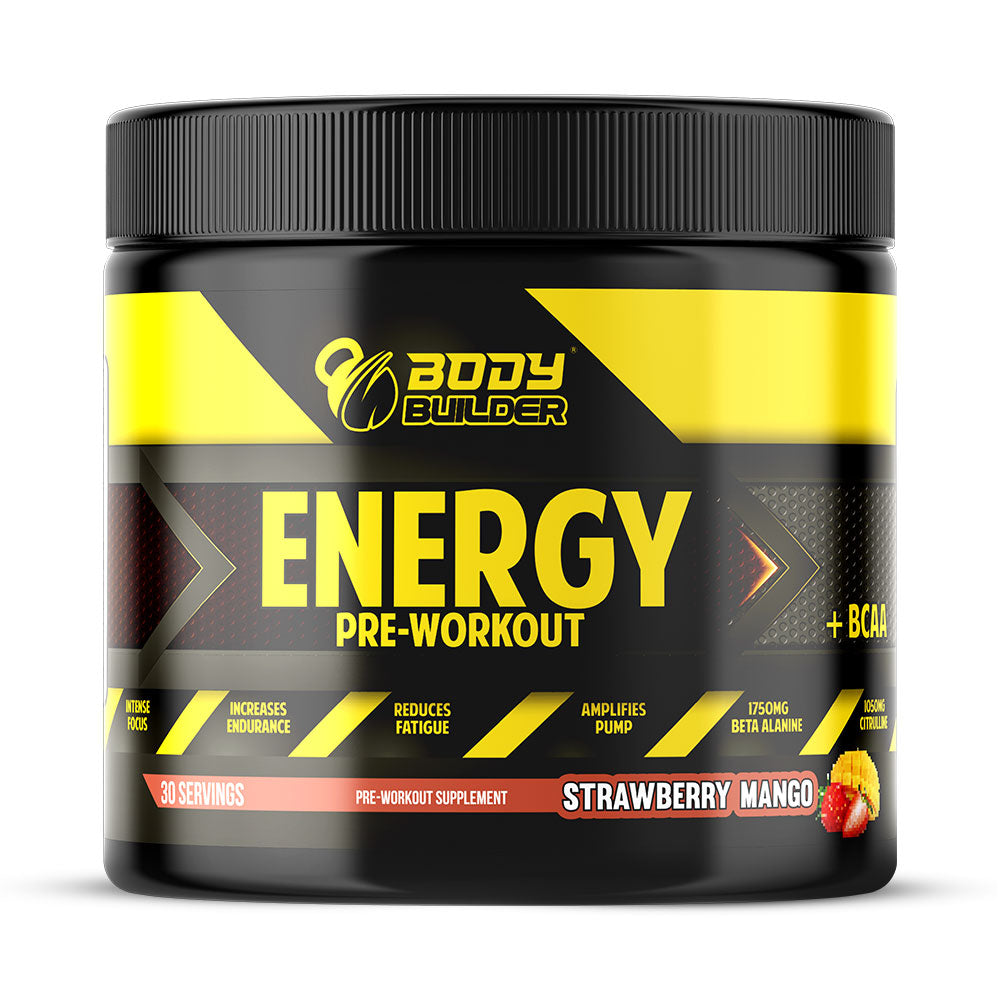Body Builder Pre-Workout Energy Plus BCAA, Strawberry Mango, 30 servings - Body Builder