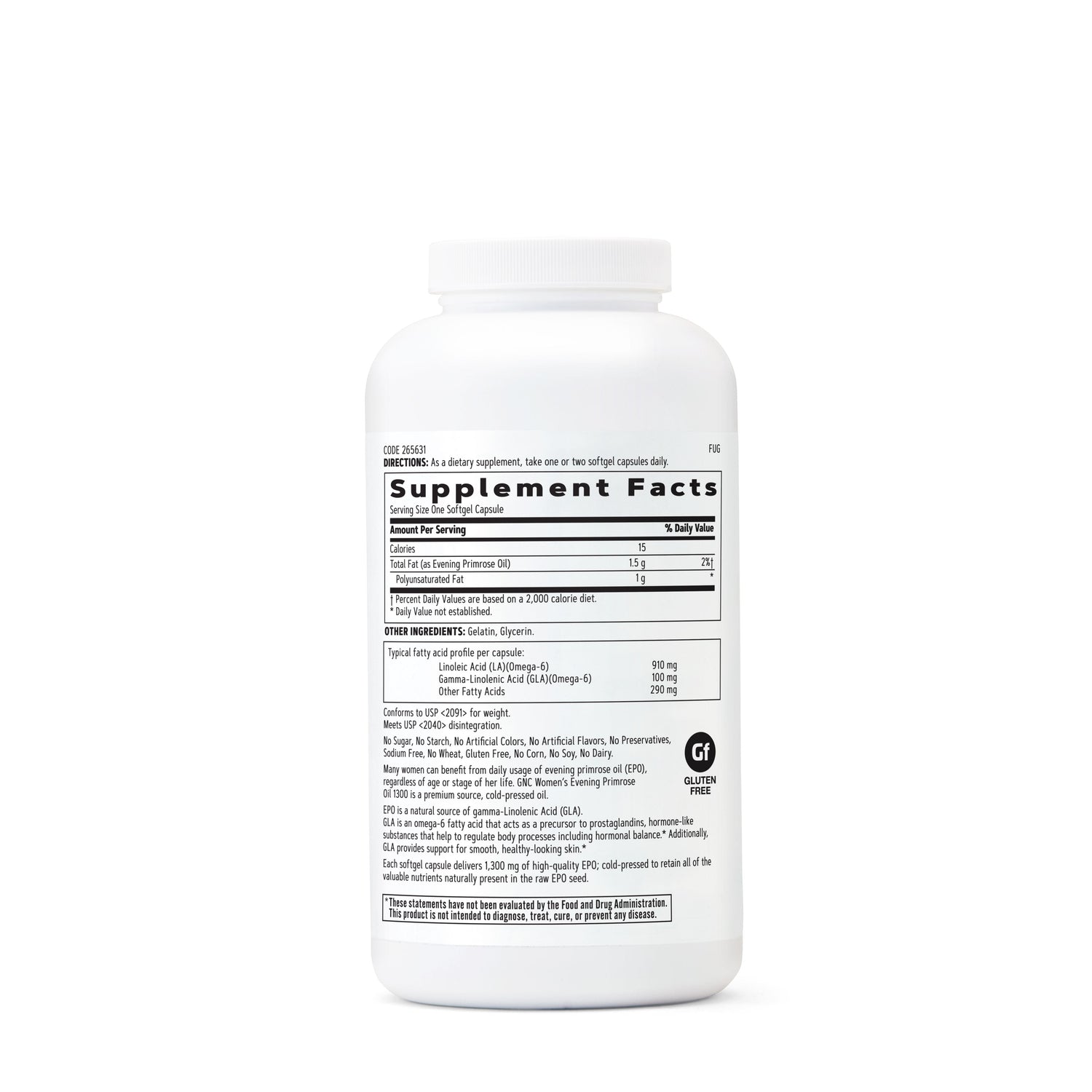 تركيبتنا غير معدلة وراثيًا ومشتقة من مصادر ممتازة للزيت المضغوط على البارد. لا يحتوي زيت زهرة الربيع المسائية من جي إن سي على سكر أو نشا أو ألوان صناعية أو مواد حافظة أو ذرة أو فول الصويا أو منتجات الألبان. للحصول على الفوائد المثلى، ما عليك سوى تناول كبسولة واحدة أو اثنتين من الكبسولات الطرية يوميًا كمكمل غذائي.