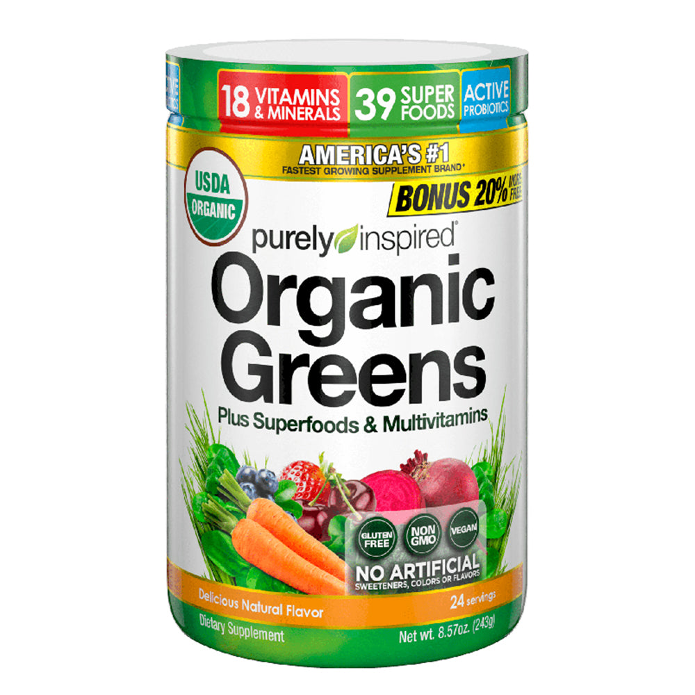 Purely Inspired Organic Greens, Unflavored, 24 هو مكمل غذائي مصمم لتوفير المغذيات الدقيقة الأساسية بكفاءة. تشتمل كل حصة على 39 نوعًا من الأطعمة الفائقة والبروبيوتيك و18 فيتامينًا ومعدنًا، بالإضافة إلى مضادات الأكسدة C وE. المنتج معتمد كمنتج عضوي من وزارة الزراعة الأمريكية، وخالي من الغلوتين، وغير معدل وراثيًا، وصديق للنباتيين. لا يحتوي على مواد تحلية صناعية أو ألوان أو نكهات.