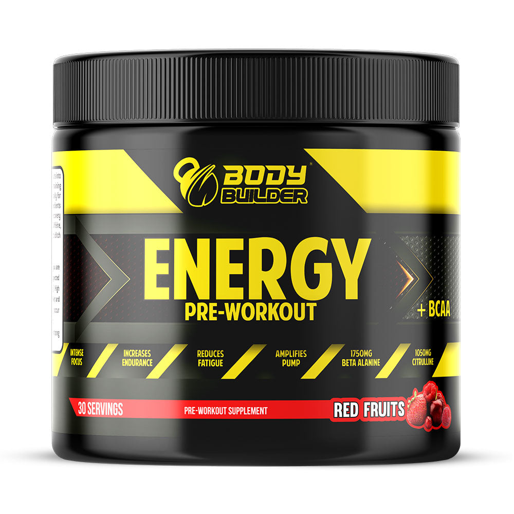 Body Builder Energy PreWorkout Plus BCAA, Red Fruit, 30 servings, is designed to enhance your workout performance. This supplement combines preworkout ingredients with BranchedChain Amino Acids (BCAAs) to support lean body mass, strength, power output, endurance, and recovery.