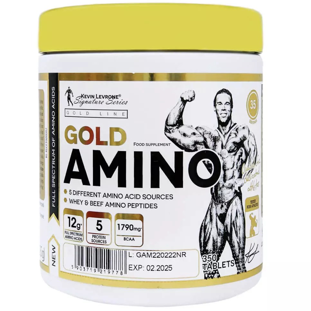 Kevin Levrone Gold Amino, 350 Tablets, is a dietary supplement designed to enhance amino acid intake from five different sources. This product is recommended for adults seeking to support their physical and mental performance, particularly during periods of intense training and activity.