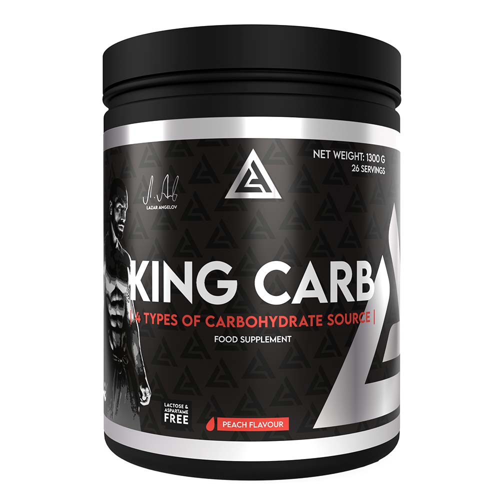 Lazar Nutrition King Carb, Peach, 26, is a comprehensive carbohydrate supplement designed to support bodybuilding goals. This product features a blend of four types of carbohydrates, ensuring both fast and slow digestion rates. Fastdigesting carbohydrates aid in muscle recovery by quickly resynthesizing glycogen and increasing insulin concentration. Slowdigesting carbohydrates provide a sustained energy source, maintaining even blood sugar levels and offering higher fiber and protein content.