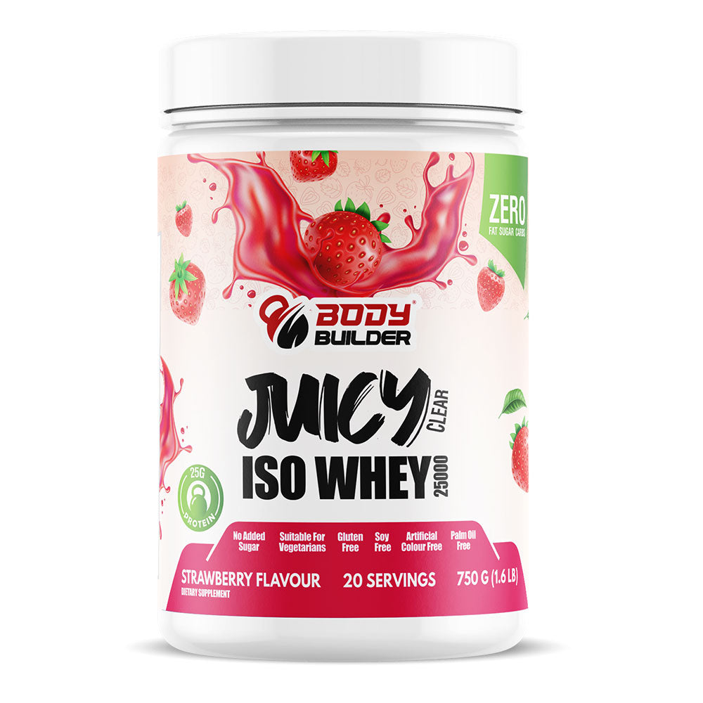 Body Builder Juicy Clear ISO Whey, Strawberry, 1.6 LB, is a highquality musclebuilding supplement designed for fitness enthusiasts aiming to increase muscle growth and achieve a lean physique. Each serving provides 25 grams of Whey Protein Isolate, ensuring rapid protein absorption to support muscle recovery. The product includes 109 mg of LCarnitine to aid fat burning and enhance exercise performance, and 109 mg of CLA, which may help reduce body fat and improve lean body mass, though more research is needed to confirm its efficacy.