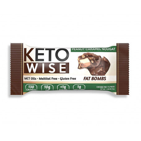 Keto Wise Fat Bombs, Peanut Caramel Nougat, 1 Piece, are specially designed candies that target 75% of their calories from fat. Each 32g piece is formulated with a unique blend of chocolate containing MCT oil to support optimal keto results. These fat bombs are maltitolfree and contain zero added sugar, making them a suitable snack for those following a ketogenic diet.