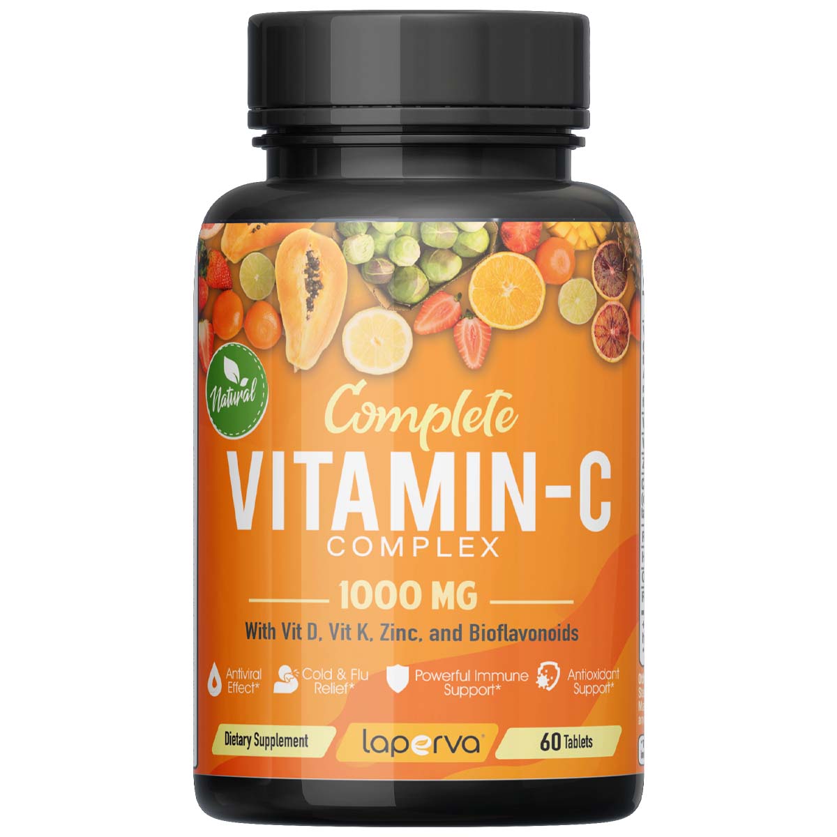 Laperva Complete Vitamin C Complex is a dietary supplement that provides 1000 mg of Vitamin C per tablet. Each bottle contains 60 tablets. The product includes natural extracted Vitamin C, Vitamin D, Vitamin K, and Zinc, along with other essential nutrients. These components work together to strengthen and enhance immune cells. The formula also incorporates Rose Hips, Rutin, Hesperidin, Citrus Bioflavonoids, and Polyphenol. These ingredients help protect against free radical damage, promote healthy skin, and support a healthy immune system.