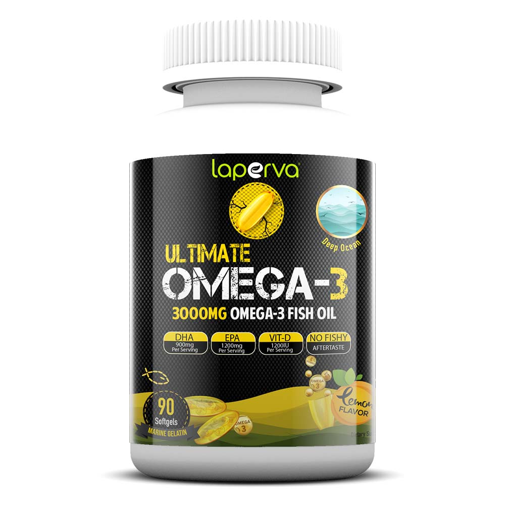 Laperva Ultimate Omega3 Fish Oil is a highpotency supplement designed to support cardiovascular health. Each serving provides 3000 mg of fish oil, delivering an optimal balance of EPA and DHA to help reduce bad cholesterol and triglycerides. The formula is fortified with 1200 IU of Vitamin D per serving, which aids in boosting immunity and bone health.