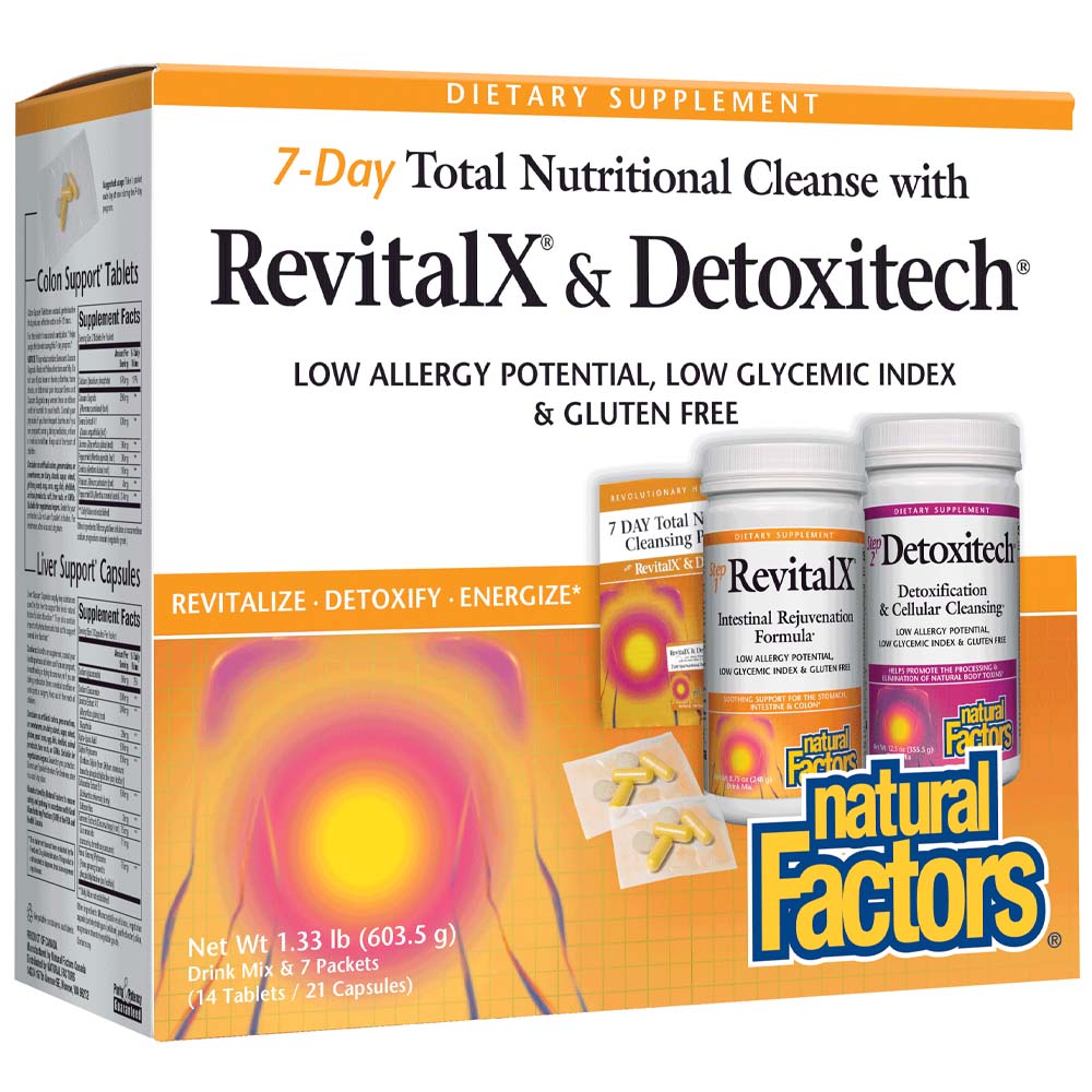 The Natural Factors Revitalx and Detoxitech 7 Day Kit Powder, 1.3 lb, is a comprehensive nutritional cleanse designed to support gastrointestinal health and detoxification. This kit includes lowallergy, glutenfree, and lowglycemicindex ingredients to ensure minimal allergenic potential and stable blood sugar levels. The program is structured into two steps: RevitalX and Detoxitech.