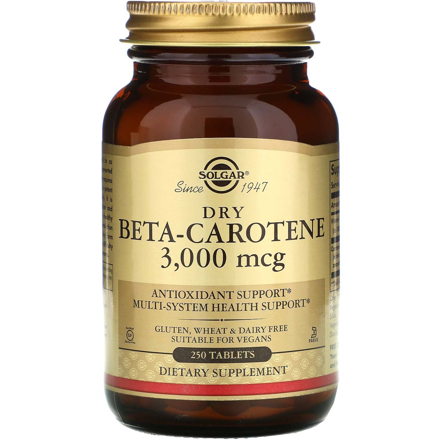 Solgar Dry BetaCarotene provides 3000 mcg of betacarotene per tablet, with a total of 250 tablets per bottle. Betacarotene is a powerful antioxidant that supports healthy vision, skin, and immune system function. It is known as ProVitamin A because the body converts it into Vitamin A as needed. This product is formulated in a dry, oilfree form, making it suitable for individuals who have difficulty digesting oilbased supplements.